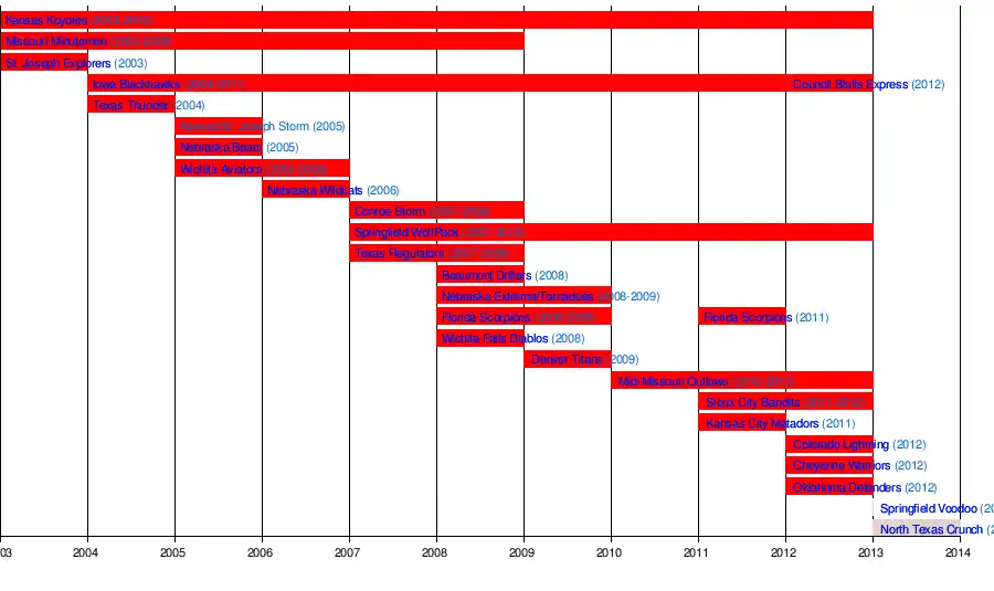 After the 2012 season, several teams left to start the Champions Professional Indoor Football League, including the Kansas Koyotes, which was sold off. An attempt was made at a 2013 season, but only one team, North Texas Crunch, played any kind of schedule. In 2015, the Crunch became one of four teams to join the North American Indoor Football League for its inaugural season.[10]