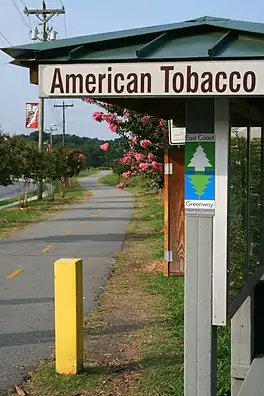 The American Tobacco Trail (ATT) is a 22.6-mile (36.4 km) long Rails-to-Trails project located in the Research Triangle region of North Carolina, running along an abandoned railroad bed originally built for the American Tobacco Company in the 1970s. The route crosses through portions of Durham County (including the City of Durham), Chatham County, and Wake County (including the Town of Cary, North Carolina). The ATT is part of the East Coast Greenway and is open to pedestrians, cyclists, equestrians (in non-urban sections) and other non-motorized users.
