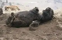 - ↑ McMillan, Brock R.; Cottam, Michael R.; Kaufman, Donald W. (2000). "Wallowing Behavior of American Bison (Bos Bison) in Tallgrass Prairie: An Examination of Alternate Explanations". American Midland Naturalist. 144 (1): 159–67. doi:10.1674/0003-0031(2000)144[0159:WBOABB]2.0.CO;2. ISSN 0003-0031. JSTOR 3083019. S2CID 86223655.