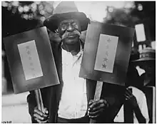 Educated, urban, middle-class southerners generally supported entering the war, and many worked on mobilization committees. In contrast to this many rural southern whites opposed entering the war.[46] Those with more formal education were more in favor of entering the war and those in the south with less formal education were more likely to oppose entering the war. Letters to newspapers with spelling or grammatical errors were overwhelmingly letters which opposed entry into the war, whereas letters with no spelling or grammatical errors were overwhelming those which supported entry into the war.[47] When the war began Texas and Georgia led the southern states with volunteers. 1,404 from Texas, 1,397 from Georgia, 538 from Louisiana, 532 from Tennessee, 470 from Alabama, 353 from North Carolina, 316 from Florida, and 225 from South Carolina.[48] Every southern Senator voted in favor of entering the war except for Mississippi firebrand James K. Vardaman.[49] By coincidence, there were some regions of the south which were more heavily in favor of intervention than others. Georgia provided the most volunteers per capita out of any state in the union before conscription and had the highest portion of pro-British newspapers before America's entry into the war. There were five competing newspapers which covered the region of Southeast Georgia, all of whom were outspokenly Anglophilic during the decades preceding the war, and during the early phases of the war. All five of which also highlighted German atrocities during the rape of Belgium and the murder of Edith Cavell. Other magazines with nationwide distribution which were pro-British such as The Outlook and The Literary Digest had a disproportionately high distribution throughout every region of the state of Georgia as well as the region of northern Alabama in the area around Huntsville and Decatur (when the war began there were 470 volunteers from the state of Alabama, of these, over 400 came from Huntsville-Decatur region).[50][51][52] Support for American entry into the war was also pronounced in central Tennessee. Letters to newspapers which expressed pro-British, anti-German or pro-interventionist sentiment were common. In between October 1914 and April 1917, letters about the war to newspapers from Tennessee included at least one of these three sentiments. In the Tennessee counties of Cheatham County, Robertson County, Sumner County, Wilson County, Rutherford County, Williamson County, Maury County, Marshall County, Bedford County, Coffee County and Cannon County over half of the letters contained all three of these elements.[53] In South Carolina there was support for America entering the war. Led by Governor Richard I. Manning, the cities of Greenville, Spartanburg, and Columbia had started lobbying for army training centers in their communities, for both economic and patriotic reasons, in preparation for American entry into the war. Similarly, Charleston had interned a German freighter in 1914, and when the freighter's skeleton crew tried to block Charleston harbor they were all arrested and imprisoned. From that point on Charleston was buzzing with "war fever." 1915, 1916 and early 1917 were all years when Charleston and the low country coastal counties to the south of Charleston, were all gripped by sentiment that was very "pro-British and anti-German."[54][55][56]