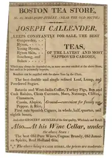 - Tea & coffee warehouse advertisement listing teas for sale in the Boston Almanac, 1856, described as a 13-year-old business supplying "families, hotel keepers, boarding houses, ship's use, and schools"
