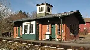 Passenger service on the CV south of the Vermont state line ended on September 27, 1947; the station was modified for other uses.[5][4] On July 18, 1989, the Amtrak Montrealer (which had been discontinued in 1987 due to poor track conditions on the Connecticut River Line in Massachusetts and the CV in Vermont) was restored on a new routing via Amherst, with a stop there.[6] The building, which is privately owned, was restored to its original condition in 1992. The interior was split between a passenger waiting area and a commercial space.[5][3] On April 1, 1995, the Montrealer was cut back to St. Albans, Vermont and renamed as the Vermonter.[7]