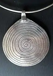 During the "Year of Morocco" cultural events in France in 1999, she presented her first collection of personal jewellery, made of historical silver pieces of the Berber tradition with her own additions. One example is a silver disk with a traditional spiral pattern on one side and Agueznay's contemporary addition on the other side. The next year, she created another collection, with variations of hand-made textile buttons (aqad), commonly used for traditional caftans.[6]