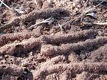 Dry twigs covered with soil by feeding activities of encrusting termites, Gnathamitermis perplexus in the Sonoran Desert, Arizona | |