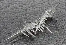 In paleontology, ammonium chloride vapor is deposited on fossils, where the substance forms a brilliant white, easily removed and fairly harmless and inert layer of tiny crystals that covers up any coloration the fossil may have, and if lighted at an angle highly enhances contrast in photographic documentation of three-dimensional specimens.[21] The same technique is applied in archaeology to eliminate reflection on glass and similar specimens for photography.[22] In organic synthesis saturated NH4Cl solution is typically used to quench reaction mixtures.[23]