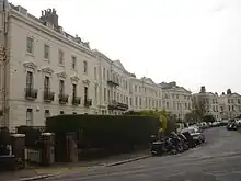 Nearby Montpelier Crescent was Wilds junior's largest-scale independent work.[39] Built between 1843 and 1847[40] in the Seven Dials area, whose development had been stimulated by the recent opening of the nearby railway station, it was laid out as a curving terrace of mansions, each divided into two dwellings. Some had pilasters decorated with ammonite capitals.[39] The section of the crescent now numbered 7–31 is listed at Grade II*;[41] the other houses are of a different design and are newer:[19][42] they date from around 1855 and are listed at Grade II in four separate parts.[43][44][45][46]