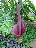 Amorphophallus (from Ancient Greek amorphos, "without form, misshapen" + phallos, "penis", referring to the shape of the prominent spadix) is a large genus of some 200 tropical and subtropical tuberous herbaceous plants from the Arum family (Araceae), native to Asia, Africa, Australia and various oceanic islands.[3][4] A few species are edible as "famine foods" after careful preparation to remove irritating chemicals.[5] The genus includes the Titan arum (A. titanum) of Indonesia, which has the largest inflorescence of any plant in the genus, and is also known as the 'corpse flower' for the pungent odour it produces during its flowering period, which can take up through seven years of growth before it occurs.[6]