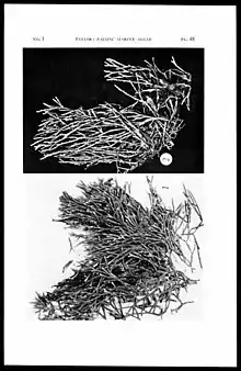 The holotype of the species was collected from a type locality called the "Côtes du Portugal"[11] (the coast of Portugal) by an unknown collector and was donated to the Lamouroux herbarium by de Beauvois,[12] where it remains as of 2013.[10] The holotype specimen consists of part of a single branched axis with calcified intergenicula and uncalcified genicula, as well as eight fragmentary parts of the same specimen, some of which have genicula.[13]