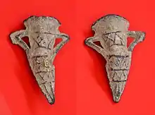 North-African production was based on an ancient tradition which may be traced back to the Phoenician colony of Carthage.[23] Phoenician amphorae had characteristic small handles attached directly onto the upper body. This feature becomes the distinctive mark of late-Republican/early imperial productions, which are then called neo-Phoenician. The types produced in Tripolitania and Northern Tunisia are the Maña C1 and C2, later renamed Van der Werff 1, 2, and 3.[24] In the Aegean area the types from the island of Rhodes were quite popular starting from the 3rd century BC due to local wine production which flourished over a long period. These types developed into the Camulodunum 184, an amphora used for the transportation of Rhodian wine all over the empire. Imitations of the Dressel 2-4 were produced on the island of Cos for the transportation of wine from the 4th century BC until middle imperial times.[25] Cretan containers also were popular for the transportation of wine and can be found around the Mediterranean from Augustan times until the 3rd century AD.[26] During the late empire period, north-African types dominated amphora production. The so-called African I and II types were widely used from the 2nd until the late 4th century AD. Other types from the eastern Mediterranean (Gaza), such as the so-called Late Roman 4, became very popular between the 4th and the 7th century AD, while Italic productions ceased.
