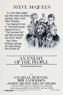 An Enemy of the People is a 1978 American drama film directed by George Schaefer and based on Arthur Miller's 1950 adaptation of Henrik Ibsen's 1882 play. The film stars Steve McQueen in the lead role of scientist Thomas Stockmann, Charles Durning as his brother Peter, and Bibi Andersson as his wife Catherine.[2][3][4][5][6]