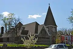 The first house erected in the new subdivision was a two-story brick building on Harrison Street (on the southwest corner of Harrison and Monroe Streets), and next to it on Monroe Street (on the site of the former Enoch Tucker farmhouse) rose a brick structure which held George F. Pyle's grocery store.[12] In 1855, Van Hook himself built "Cedar Hill", a lavish mansion on Jefferson Street near the Fox Mansion.[6][23] Dr. Arthur Christie, a wealthy Englishman, purchased 50 acres (20.25 hectares) of land on the north side of Harrison Street and named his estate Fairlawn.[12] Lewin Talburtt built a spectacular 21-room mansion, "Mont View," on what is now Mount View Place SE; his son, George Washington Talburtt, lived there for many years (although it is an apocryphal story that John Howard Payne composed the song Home! Sweet Home! there).[12][26] The first church in the area, the Episcopalian "Ryan's Chapel," opened in 1862.[16]