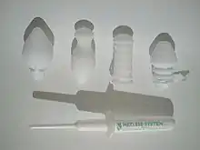 An anal plug (anal tampon or anal insert) is a medical device that is often used to treat fecal incontinence, the accidental passing of bowel moments, by physically blocking involuntary loss of fecal material.[1] Fecal material such as feces are solid remains of food that does not get digested in the small intestines; rather, it is broken down by bacteria in the large intestine. Anal plugs vary in design and composition, but they are typically single-use, intra-anal, disposable devices made out of soft materials to contain fecal material and prevent it from leaking out of the rectum. The idea of an anal insert for fecal incontinence was first evaluated in a study of 10 participants with three different designs of anal inserts.[1]
