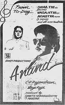 Anand is a 1987 Indian Tamil-language romantic drama film, directed by C. V. Rajendran and produced by Sivaji Productions. The film stars Prabhu, Radha and Jayashree. A remake of the 1987 Telugu film Majnu,[1] it was released on 20 November 1987.[2]