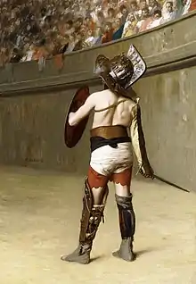 Descriptions of battles against various Gallic tribes, heavily contrasts the popular picture of the wild and naked Celtic warrior. Caesar even speaks of the Helvetii fighting in close order in an organized fashion, forming a phalanx as a defense against cavalry and advancing in a close formation.[12] He also speaks of arrows being used against his troops crossing rivers and against the besiegers of Gergovia, capital of the Arverni[13] - one of the few engagements in which Vercingetorix outmanoeuvred Caesar. He mentions the use of javelins by the Belgic tribe, the Nervii,[14] but despite Roman writers frequently referring to the use of swords by the Celts in battle, Caesar never mentions Gallic troops fighting en masse with swords. By the mid-1st century BC, Celtic tribes in Gaul may have had a core of properly trained and equipped Gallic leaders, in addition to the tribal levy of lightly armed and armored Gauls.