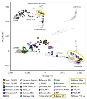 The closely related hunter-gatherers from the Baikal region and adjacent regions of Siberia are associated with the eastern Baikal hunter-gatherers of the Fofonovo culture ("Fofonovo_EN"), and the western Baikal hunter-gatherers from the Kitoi culture ("Baikal_EN", 5200–4200 BCE or Shamanka_EN),[13][14] as well as the Early Bronze Age Baikal populations associated with the Glazkovo culture ("Baikal_EBA", circa 2500 BCE or Shamanka_EBA).[15][12] They cluster broadly with other Ancient Northeast Asian (ANA) populations, but are differentiated from them via drift associated with an earlier inland expansion route, and minor geneflow from Ancient North Eurasians (ANE) at c. 11% (5-20%).[16][17][18][19] They also display genetic affinity with the earlier Yumin hunter-gatherers from Northeast China, as well as the Neolithic and Bronze Age groups in Yakutia (Yakutia_LNBA) and Krasnoyarsk (kra001) in the Altai-Sayan region. These populations are sometimes described as "Neo-Siberians" and can be differentiated from proper ANA/Amur populations represented by the Neolithic Devils Cave specimen, but share a common recent origin via their Ancient Northern East Asian ancestor.[20][21][22]