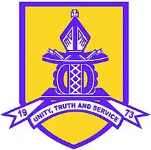 The school's crest is composed of four elements: a golden shield with purple outline; a purple and white bishop's mitre; a purple Akan male stool; and a white scroll bearing the motto of the school, "Unity, truth and service". The shield refers to the "shield of faith" in Ephesians 6:16. The shield is also a symbol of defence and security. The indigenous Akan male stool in the centre of the insignia represents the contribution of traditional authorities towards the establishment and growth of the school. These contributions include the provision of land, guidance, and encouragement. The Anglican bishop's mitre symbolizes the school's religious affiliation with the Anglican Church. The mitre sitting on the stool also represents peace, harmony, and unity between the Church and the society through education. The white scroll located on the lower half of the crest bears the school's motto: "Unity, Truth and Service". Three colours are found in the school's crest: gold symbolizes honour and loyalty; purple symbolizes priesthood and kingship; white symbolizes purity and virtue.[4]