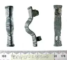 The small-long brooch is similar to the cruciform and the great square-headed brooch.[13] These copper alloy brooches have the greatest number of design variations of Anglo-Saxon brooches created in the early Anglo-Saxon era. The small-long head includes square, trefoil and cross shapes and the foot can be found in triangular, lobed, crescent, bifurcated or lozenge shapes.[17]
