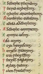 The ruling dynasty of East Anglia, the Wuffingas, were named for Wuffa, son of Wehha, who is made the ancestor of the historical Wuffingas dynasty, and given a pedigree from Woden.[21] Wehha appears as Ƿehh Ƿilhelming (Wehha Wilhelming - son of Wilhelm) in the Anglian Collection.[22] According to the 9th-century History of the Britons, his father Guillem Guercha (the Wilhelm of the Anglian Collection pedigree) was the first king of the East Angles,[23] but D. P. Kirby is among those historians who have concluded that Wehha was the founder of the Wuffingas line.[24] From Wilhelm the pedigree is continued back through Hryþ, Hroðmund (a name otherwise only known from Beowulf), Trygil, Tyttman, Caser (Latin Caesar, i.e. Julius Caesar) to Woden. The placement of Caesar within this pedigree perhaps defers to early traditions deriving Woden from 'Greekland'.[25] The Anglo-Saxon Chronicle gives no pedigree for this dynasty.