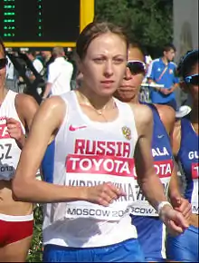 In 2007, she won the Russian Winter Championships, the European Race Walking Cup and the European Junior Championships, all 10 km races.[1] She race in the 20 km IAAF Race Walking Challenge Final, which was held in her hometown of Saransk.[1] She finished second to Olga Kaniskina.[1] She received two technique disqualifications in races in 2008.[1] In 2009, she finished in 4th at the World Championships which was retrospectively upgraded to bronze due to the disqualification of the original gold medalist, 5 days before her husband won gold.[1] In 2010, she won the summer and winter Russian titles, setting a new personal best of 1.25.11.[1] That year, she finished second in a Russian one, two, three at the European Championships.[1] At the 2011 she won a bronze medal at the World Championships.[1]