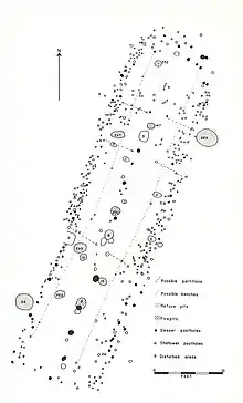 Excavations at the site yielded prehistoric artifacts, a house structure, pit features, burials and animal bone. The site consisted of two parts: the village area and a cemetery containing burials with rich grave goods.[1]