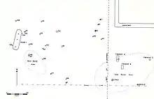 A structure was defined by the presence of post molds and other features. It was 55 feet long by 13 feet wide and oval in shape. There were 3 fireplaces along the center line and 7 refuse/cache pits inside and 2 outside the structure. Charcoal in some of the post molds implies that the structure was burned.[1]