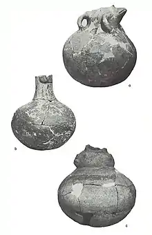 - One was a slightly squat, globular vessel decorated by a white band on one side and a white oval surrounded by red band on the other side, with a human head effigy at the mouth