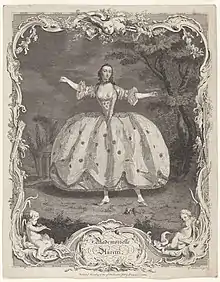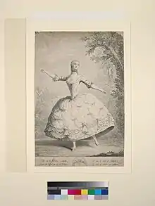 Charles Burney, after watching a performance before the Duke of Cumberland in 1746, comments "The new dances by Auretti, and the charming Violetta, afterwards Mrs Garrick, were much more applauded than the songs, which, however, for the time, had considerable merit."[8] From a dissertation on dance in The Lady's Magazine, 1785: