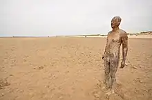 Another Place is a piece of modern sculpture by British artist Antony Gormley located at Crosby Beach in Merseyside, England. It consists of 100 cast iron figures facing towards the sea. The figures are modelled on the artist's own naked body.[1] The work proved controversial due to the naked statues but has increased tourism to the beach. After being exhibited at two other locations, it was put on display at Crosby on 1 July 2005. After some controversy, Sefton Metropolitan Borough Council decided on 7 March 2007 that the sculptures should be permanently installed at the beach.[2][3]