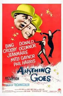 Anything Goes is a 1956 American musical film directed by Robert Lewis, and starring Bing Crosby, Donald O'Connor, Zizi Jeanmaire, and Mitzi Gaynor.[2] Adapted from the 1934 stage musical Anything Goes by Cole Porter, Guy Bolton, and P. G. Wodehouse,[3] the film is about two entertainers scheduled to appear in a Broadway show who travel to Europe, where each discovers the perfect leading lady for the female role. Bing Crosby's character, Bill Benson, goes to England and meets Mitzi Gaynor's character Patsy Blair, and he signs her as the female lead. Meanwhile, Donald O'Connor's character, Ted Adams, travels to France and meets Jeanmaire's character, Gaby Duval, and he signs her to the same role. On the return voyage, with each man having brought his leading lady along, the Atlantic becomes a stormy crossing when each man must tell his discovery that she might not get the role.