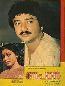 Aparan (transl. Imposter) is a 1988 Indian Malayalam-language mystery psychological thriller film written and directed by P. Padmarajan, based on his short story of the same name. It stars Jayaram, Mukesh, Shobana, Parvathy Jayaram and Madhu. The film is about mistaken identity and the problems that a young, innocent man has to undergo in his life.[1] The film was the debut of Jayaram and it was a critical as well as commercial success. The film was remade in Tamil as Manidhan Marivittan (1989). The film is considered as a cult classic in Malayalam cinema.[2]