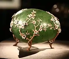 The Apple Blossom egg, also known as the Jade Chest egg, is a Fabergé egg created in the workshop of Peter Carl Fabergé for the wealthy Russian industrialist Alexander Kelch who presented it to his wife as an Easter gift in 1901. Because it was not a gift from a Russian tsar to a tsarina, it is not considered an "imperial" Fabergé egg but rather, in this instance, is called one of the "Kelch" eggs. It is one of the largest such eggs ever created in Fabergé's workshop. It is also one of the very few Fabergé eggs which lies on its side rather than upright.