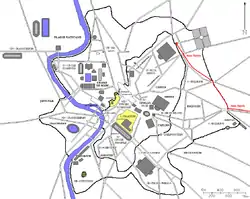 From here on the conduit used the Aurelian Walls and crossed Via Tiburtina on an arch which became Porta Tiburtina. The route passed the Viminal gate, where Termini Station stands today, and ended near the Porta Collina, where the main distribution castellum was, near the current Via XX Settembre. It passed through 14 castella divisorum delivering water to four regions.[3]