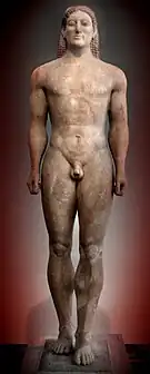 Stylistically the Archaic period begins with a phase called Dedalic or Orientalizing which, as this name suggests, betrays the influx of elements from the East. From there, Greek craftsmen learned to produce terracotta reliefs in series from molds, a practice that defined stereotyped formal solutions for the representation of the human figure that would become the basis for the organization of full-figure statuary as well. The scheme of these works was strictly standardized, homogenizing the entire production of figurative sculpture and eliminating all traces of creative freedom and naturalism found in the statues of the times of the Egyptian cultures. The bodies assume a hieratic posture, in a frontal position, arms hanging down at their sides or one folded at the chest, one leg in advance suggesting movement, with long curly hair and facial expression fixed in a smile outline. Following the example of the geometric bronzes, the men are naked, and the women are dressed in elaborate costumes.[17] This typology, known as kouros in the male case, and kore in the female, was the most important during the Archaic period. It seems to have derived from Cycladic statues,[26] and would be definitely consolidated from c. 650 BC, acquiring a monumental dimension possibly inspired by the example of Egyptian statuary, known by the Greeks who established some colonies there and by travelers.[27]