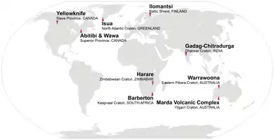 Onverwacht Group[35] | 3445 ± 3[35] | Barberton | Kaapvaal Craton | South Africa |