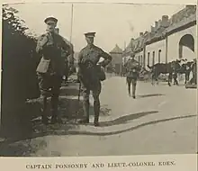 In 1914 Eden was part of the British Expeditionary Force along with the 2nd Battalion of the Oxford and Buckinghamshire Light Infantry as part of C Company[36] and on 20 October 1914 is listed as the senior officer present, heading up the four companies.[37][38][39] The diary for the period covering the First Battle of Ypres records an attack towards Poelcappelle on the 21 October 1914 as having resulted in Eden being wounded. The Story of the Oxfordshire and Buckinghamshire Light Infantry by Sir Henry Newbolt goes into more detail, explaining that the battalion was attempting to storm a gated gap in a hedge covered by machine guns and barbed wire that stood between them and the German defences, with Eden being one of ten officer casualties and circa 200 enlisted men casualties from this action.[40] He was taken away by ambulance, returning on the 5 January 1915. On the 1 April 1915 he is listed as being part of the battalion headquarters and once again the commanding officer and was mentioned by Field Marshal French in his 31 May 1915 despatch,[41][42] which was followed by his promotion to Brevet Lieutenant-Colonel on 3 June 1915,[43] with this being recorded in the battalion diary on the 25 June 1915.