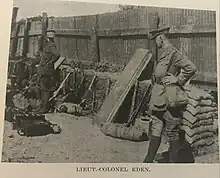 During the period between the Second Boer War and the First World War Eden became the last adjutant of the 3rd (Militia) Battalion of The Oxfordshire Light Infantry, finishing this service on 31 March 1908.[31] He was also posted in India for a period of time during this decade, serving as the Station Staff Officer and Assistant Cantonment Magistrate of the garrison at Subathu from October 1904.[32] The Soldiers of Oxfordshire Museum holds a photograph of him and his company dated December 1906 taken in Lucknow with Eden named as a Major in this photograph due to his Brevet Major status, but he was fully promoted to Major on 18 September 1911.[33] In October 1911 following his promotion to full Major he was transferred to the 2nd Battalion in Aldershot.[34]