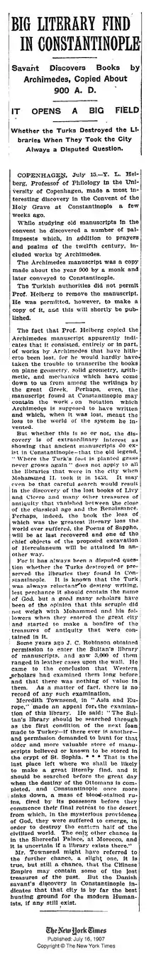 The Biblical scholar Constantin von Tischendorf visited Constantinople in the 1840s, and, intrigued by the Greek mathematics visible on the palimpsest he found in a Greek Orthodox library, removed a leaf of it (which is now in the Cambridge University Library). In 1899 the Greek scholar Papadopoulos-Kerameus produced a catalog of the library's manuscripts and included a transcription of several lines of the partially visible underlying text.[7] Upon seeing these lines Johan Heiberg, the world's authority on Archimedes, realized that the work was by Archimedes. When Heiberg studied the palimpsest in Constantinople in 1906, he confirmed that the palimpsest included works by Archimedes thought to have been lost. Heiberg was permitted by the Greek Orthodox Church to take careful photographs of the palimpsest's pages, and from these he produced transcriptions, published between 1910 and 1915 in a complete works of Archimedes. Shortly thereafter Archimedes' Greek text was translated into English by T. L. Heath. Before that it was not widely known among mathematicians, physicists or historians.