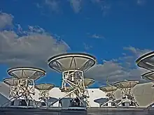 ![]() The 8 antennas of the Arcminute Microkelvin Imager Large Array viewed from Barton Road in 2012 | |