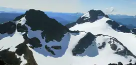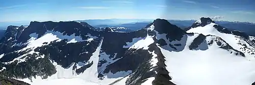 Comox Glacier summit (left), Argus Mountain (center), and The Red Pillar (right), viewed from summit of Mount Harmston, located to the North.