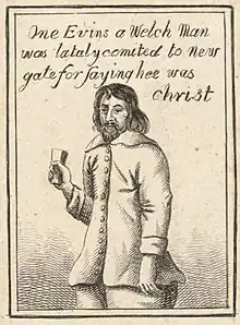 Evans was born about 1607 in Llangelynin parish and was apprenticed to a tailor at Wrexham. While living in Wales he had seen visions and prophetic dreams which were accentuated when he went to London in 1629. In London he made vain efforts to warn King Charles I of perceived dangers, but succeeded in telling the Earl of Essex to his face of his future promotions.[1] Evans became interested in the multifarious sects that flourished under the new liberty of Charles I's reign, opposing most of them, especially the tenets of the Fifth Monarchist.[1] He took particular offence towards Christopher Feake and William Aspinwall.[1]