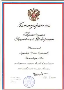 - Gratitude President of the Russian Federation (9 April 1996 г.) — for a great personal contribution to the development of Russian cosmonautics