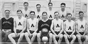 In the 1929–30 season, Charles Bassett took over as head coach, leaving the head coaching job at Texas A&M that he held for two years without finding much success, going a paltry 16–18 (5–15) in his two years as head coach in College Station, including a last-place finish in conference play for the 1927–28 Southwest Conference season.[10][11] Arkansas's success under Bassett was limited to his first season as coach, when the Hogs won the Southwest Conference Championship with multi-sport star and current College Football Hall of Fame member Wear Schoonover garnering Second-Team All-American recognition from College Humor and earning First-Team All-SWC honors for the third straight season.[12] The Razorbacks did not finish above third place in the Southwest Conference standings for the rest of Bassett's tenure. Aside from the SWC Championship in 1930, the other major bright spot in Bassett's tenure came on January 8, 1931, when the Razorbacks defeated rival Texas, 29–21, the day UT dedicated its new gym.[13] Bassett's last season was the 1932–33 season, when the Razorbacks went 14–7 overall with a 6–6 conference record, the first time since the inaugural 1923–24 season that the Hogs did not finish the year with a winning record in conference play.[6] After four seasons, Bassett's overall record was 62–29 (.681).[9]