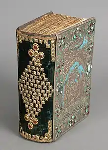 The Metropolitan Museum of Art holds an Armenian-made illuminated gospel in its collection. Created in the 13th and 17th centuries, the gospel features elaborately executed metalwork decorations, and is adorned with gems and enamel.[1]