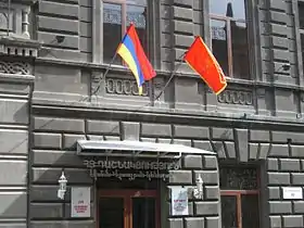The Armenian Revolutionary Federation (Armenian: Հայ Յեղափոխական Դաշնակցութիւն, romanized: Hay Heghapokhakan Dashnaktsutyun,[lower-alpha 1] abbr. ARF (ՀՅԴ) or ARF-D), also known as Dashnaktsutyun[lower-alpha 2] (Armenian: Դաշնակցություն, lit. "Federation"[lower-alpha 3]), is an Armenian nationalist and socialist political party[37][38][39] founded in 1890 in Tiflis, Russian Empire by Christapor Mikaelian, Stepan Zorian, and Simon Zavarian.[40] As of 2023, the party operates in Armenia, Lebanon, Iran and in countries where the Armenian diaspora is present. The party was also active in Artsakh until the Azerbaijani offensive in September 2023. Although it has long been the most influential political party in the Armenian diaspora, it has a comparatively smaller proportional presence in modern-day Armenia.[41] As of October 2023, the party was represented in two national parliaments, with ten seats in the National Assembly of Armenia and three seats in the Parliament of Lebanon[42][43] as part of the March 8 Alliance.