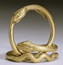 Armillae were made in a substantial masculine style and produced in a variety of designs: a solid, hinged cuff, sometimes inscribed with legionary emblems or decorated with incised patterns; an open-ended spiral; a chunky, rounded bracelet with open or overlapping ends; or a torc in miniature. Armillae which were open-ended or had overlapping ends often featured knobs or snake-heads as terminals.[7]