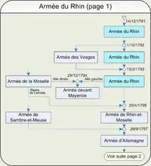 On 29 December 1794, the left wing of the Army and the right wing of the Army of the Moselle combined to form the Army besieging Mainz. The rest of the Army of the Moselle united with the Army of the Rhine on 20 April, to form the Army of the Rhine and Moselle. This army united with the Army of Sambre-et-Meuse to form the Army of Germany on 29 September 1797.[8]