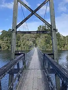 In the early days of the settlement of Moana, Noel Peat owned land in the township and across the mouth of the Arnold River, and since 1929 had petitioned the government to build a bridge at Moana connecting the two. No bridge was built, until in 1990 as part of New Zealand sesquicentennial celebrations Fletcher Challenge and the Department of Conservation collaborated on the construction of a 83-metre footbridge, which took 15 weeks to build, opening on 15 September 1990. It provided public access to the Tasman Forest Accord Scenic Reserve, 2050 ha of native forest protected from logging in 1989. The Lake Brunner Centennial Committee later developed a walking trial along the western shore of the Arnold River, now known as the Rakaitane Walk.[5]: 54