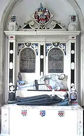 Acland's monument, said to have been erected by his grieving father,[10] survives in Landkey Church. It shows Sir Arthur lying prostrate, in full armour, propped up on his left elbow. In front and below him lies his wife Eleanor Mallet.[7] Above are two round headed black tablets inscribed with gilt lettering.[2]