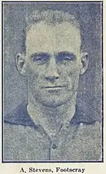 Stevens arrived at Footscray in 1927, from Victorian Football Association club Preston.[3] He was already aged 28 when he made his debut against St Kilda at Western Oval in round 10.[4] A ruckman, Stevens immediately cemented his spot in the team and in 1928 was picked in the Victorian state side to play South Australia in Adelaide.[5][6] He made 16 league appearances in the 1928 season and another 16 in 1929.[7] When Footscray captain Allan Hopkins became unavailable in 1929, Stevens filled in as club captain.[8]
