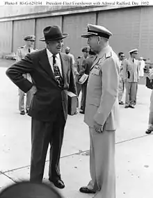 Radford meets Dwight Eisenhower in 1952. It was during this meeting that Radford so impressed the President-elect that he was nominated to be Chairman of the Joint Chiefs of Staff the next year.